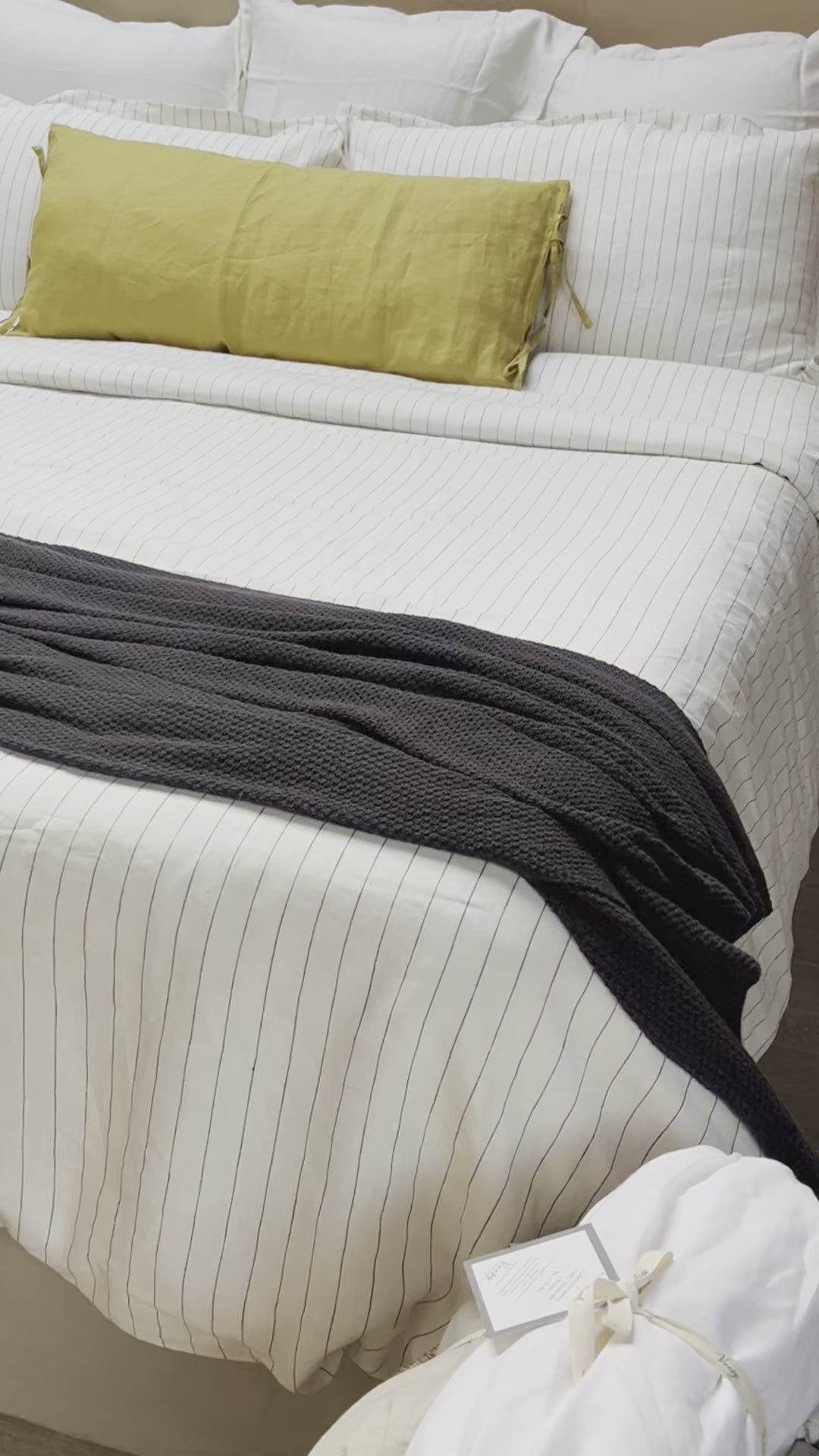 • Cubrecamas y mantas de lino: disponibles en tamaños grandes pensados para cubrir la cama completamente o funcionar como pieceras a lo ancho. Por ejemplo, nuestros cubrecamas king size cubren generosamente camas King o Super King, mientras que las mantas decorativas (throws) de lino cuentan con dimensiones versátiles para usar a los pies de la cama o sobre un sofá. (Medidas específicas dependen del diseño; ver ficha particular de cada cubrecama/manta).
